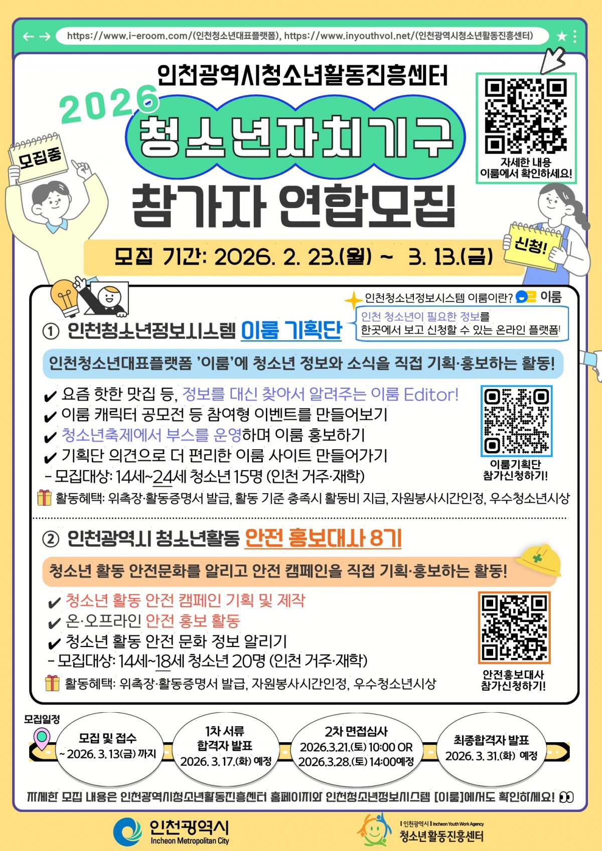 인천광역시청소년활동진흥센터에서 [이룸기획단]과 [안전 홍보대사 8기]를 모집하고 있습니다.